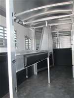 6'-10" x 19'-0" x 8'-0" Tall 2 5/16" Adjsutable Coupler Single Leg Spring Loaded Jack 2-4900# Rubber Torsion Axles 4-Wheel Electric Brakes 5-235/80R16, 10-Ply Radial Tires 5-16" Aluninum Wheels Walk-Thru Door w/ Drop Down Window w/ Heavy Duty Window Bars w/ Fold Down Step SS Drop Down Window at Head w/ Heavy Duty Window Bars SS & CS 24"x36" Bus Windows w/ Heavy Duty Window Bars at Hip SS& CS 50/50 Rear Doors w/ Windows w/ Full Width x 60" Tall Easy Lift Ramp Behind Doors 60' x 60" Wide Easy Lift Side Ramp w/ Dutch Door w/ Window Above CS 1 Quiet Ride Rolling Divider w/ Wither Shield & Head Shield Additional Divider Setting Full Width Center Gate w/ Spread Air Flow Bars w/ Large Double Swing Slam Latch Rubber Floor Mats Quiet Ride Butt & Breast Bars Split Drop Partition Slatted Solid w/ Removable Center Post 4-Two-Way Roof Vents 8-Inside Ties 3-Outside Ties 4-LED Dome Lights 1-LED 18" Awning Light 2-LED 11" Awning Lights 5-Running Lights SS & CS Pair of Extra Height Turn Signals Custom Graphics